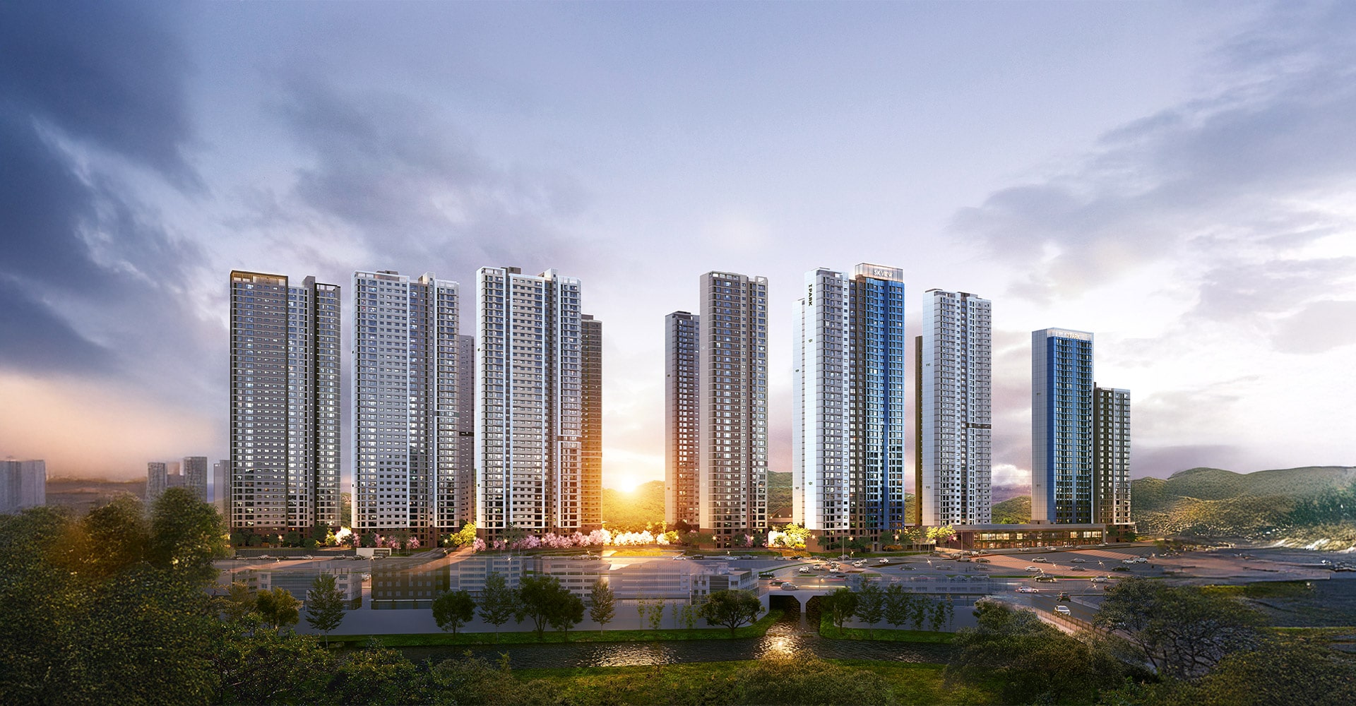 의왕시청역 SK뷰아이파크는 남향 위주 배치와 긴 통경축으로 빛과 바람의 길을 열어 두었습니다. 동간 거리 확보로 시선 간섭을 줄였고, 중앙정원과 선큰가든, 수경·산책로를 촘촘히 엮어 사계절 표정이 달라지는 ‘보는 풍경’을 단지 안에 담았습니다. 외관은 커튼월룩 특화로 간결하면서도 도시적인 인상을 남깁니다.
